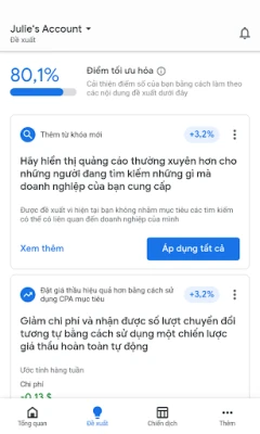 Không chỉ dừng lại ở quản lý, Google Ads còn đóng vai trò là cố vấn chiến lược của bạn. Ứng dụng cung cấp các đề xuất tối ưu hóa thông minh dựa trên dữ liệu thực tế, giúp bạn nâng cao chất lượng và hiệu quả tổng thể của các chiến dịch. Luôn cập nhật với thông báo tức thời về tình trạng quảng cáo hoặc những thay đổi quan trọng, đảm bảo bạn luôn chủ động trong mọi tình huống. Khi cần hỗ trợ chuyên sâu, bạn có thể dễ dàng kết nối với đội ngũ chuyên gia thông qua điện thoại hoặc trò chuyện trực tuyến, bất kể bạn ở đâu, để được tư vấn và giải đáp mọi thắc mắc, giúp bạn tận dụng tối đa tiềm năng từ tài khoản của mình.