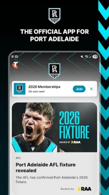 Với Ứng dụng Chính thức Port Adelaide, mọi người hâm mộ sẽ luôn cập nhật và gần gũi với đội bóng yêu thích. Trải nghiệm mọi thông tin, dù bạn đang reo hò trên khán đài hay theo dõi từ nhà.