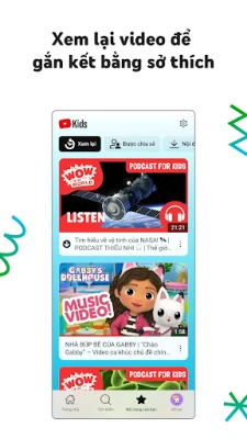 Để gắn kết và định hướng trải nghiệm số của con, YouTube Kids tích hợp nhiều công cụ kiểm soát của cha mẹ mạnh mẽ. Dễ dàng xem lại những video con bạn yêu thích hoặc những nội dung bạn đã chia sẻ cùng con thông qua thẻ "Xem lại" tiện lợi. YouTube cam kết sàng lọc và đảm bảo mọi video trên YouTube Kids đều an toàn và thân thiện với gia đình. Tuy nhiên, nếu phát hiện nội dung không phù hợp hoặc không mong muốn, bạn có thể dễ dàng báo cáo để đội ngũ của chúng tôi xem xét, giúp duy trì một môi trường lành mạnh cho trẻ.